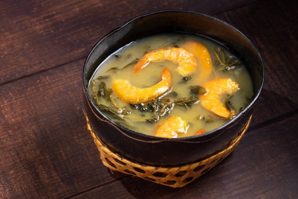 Um dos pratos mais famosos do estado, o tacacá é uma sopa feita com tucupi (caldo extraído da mandioca), jambu (erva amazônica que causa leve dormência na boca) e camarão seco. É servido quente, geralmente em cuias, e consumido como lanche ou refeição leve.